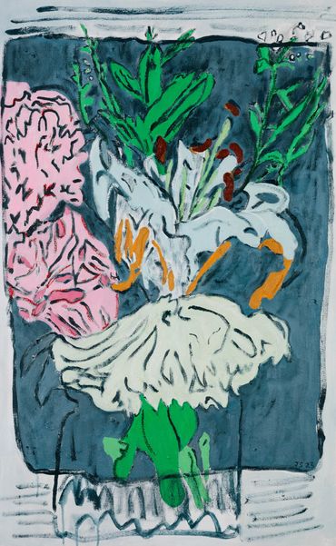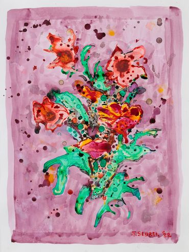 Sedrel’s most recent work has been focused on abstracted floral motifs. Painting in a loose style the resulting imagery shows vivid spatial arrangements of form and color, blurring the line between expression and objectivity. The compositions are most often of his own invention, while occasionally taking a cue from traditional still-life painting. Working in a mix of media on either canvas or paper, Sedrel compresses space, filling it with an explosion of bright, direct gestures that speak to natural abundance and the pleasures of art making unfettered by standard iconography or didactic intent.